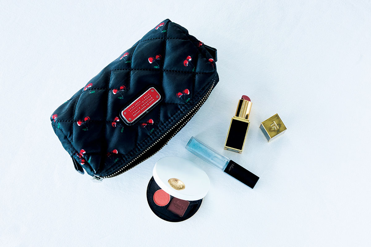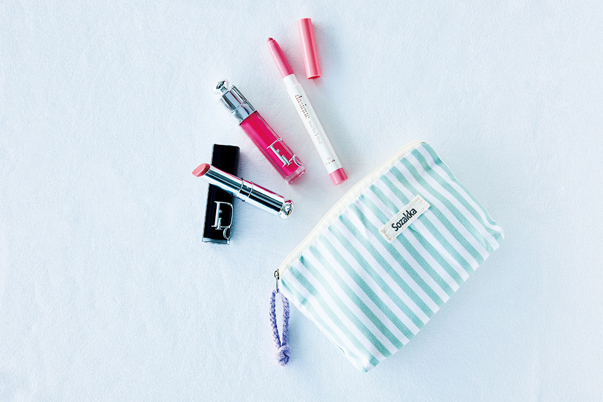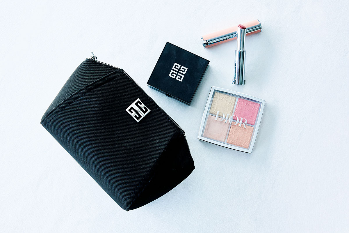 話に夢中になりメーク直しに行くのを忘れがちな女子会では、色もちのいいディオールリップが欠かせない存在。ツヤも大切だからディオールのハイライト004やSUQQUのチーク07、SUQQUのアイシャドウ14を頰や額、瞼に重ねてキラッとした輝きをプラス。必要最低限だけボナベンチュラのポーチに入れています。