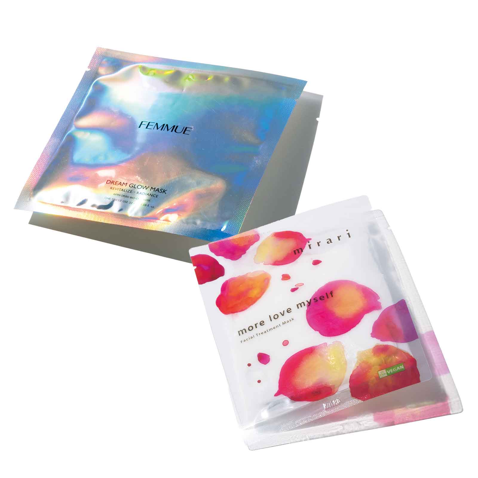 右/エイジングケア成分たっぷり。more love myself Facial Treatment Mask 5枚入り ¥3,300(mirari)