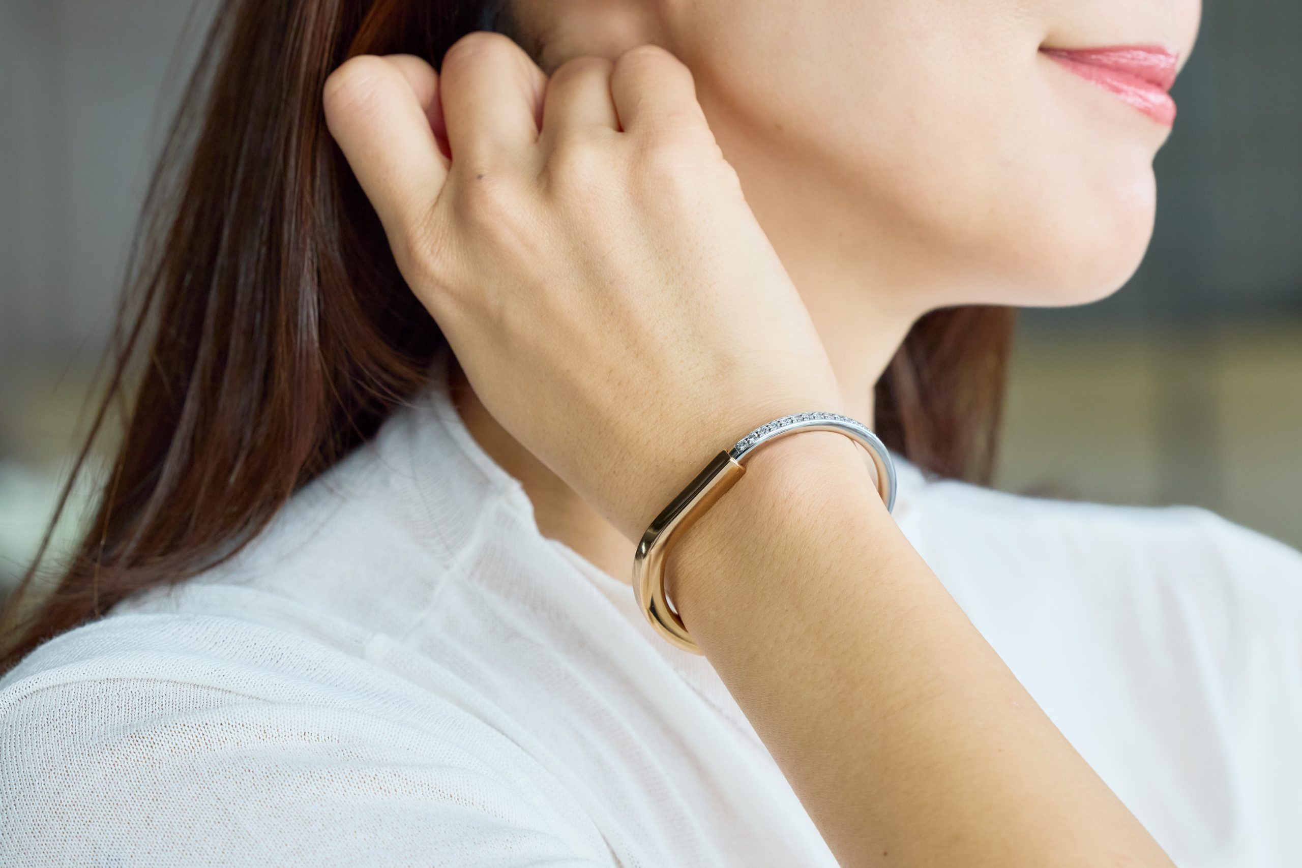 バッグの金具に合わせ、バングルもゴールドに。ティファニーのロックバングルは品良く輝くので、つけているだけで華やかな気持ちにしてくれて女子会にもってこいです。