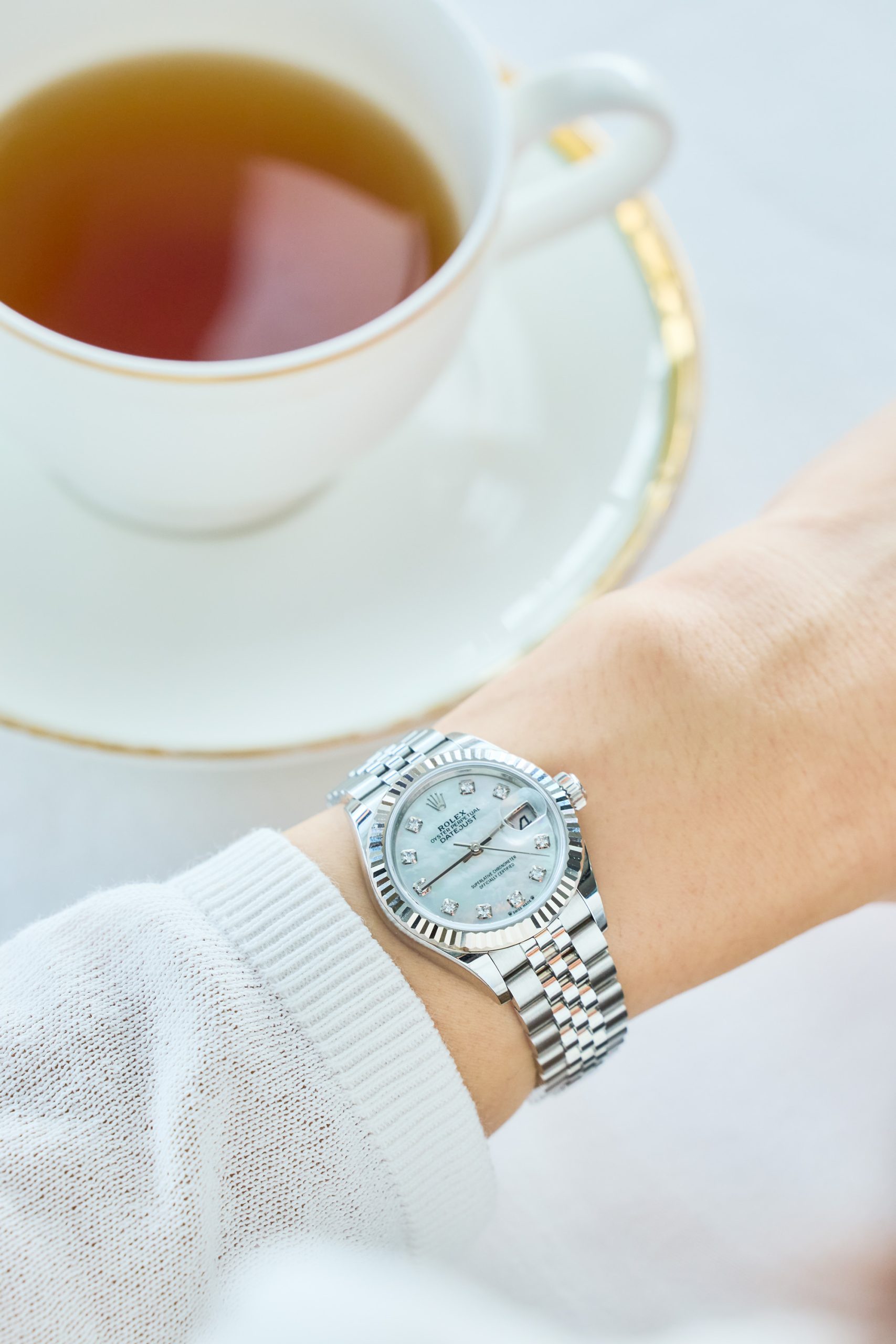 ホワイトファッションに合わせてコーデした、爽やかなロレックスのデイトジャスト。明るい文字盤や目を引くデザインが、女子会で注目してもらえるかなと思い選びました。