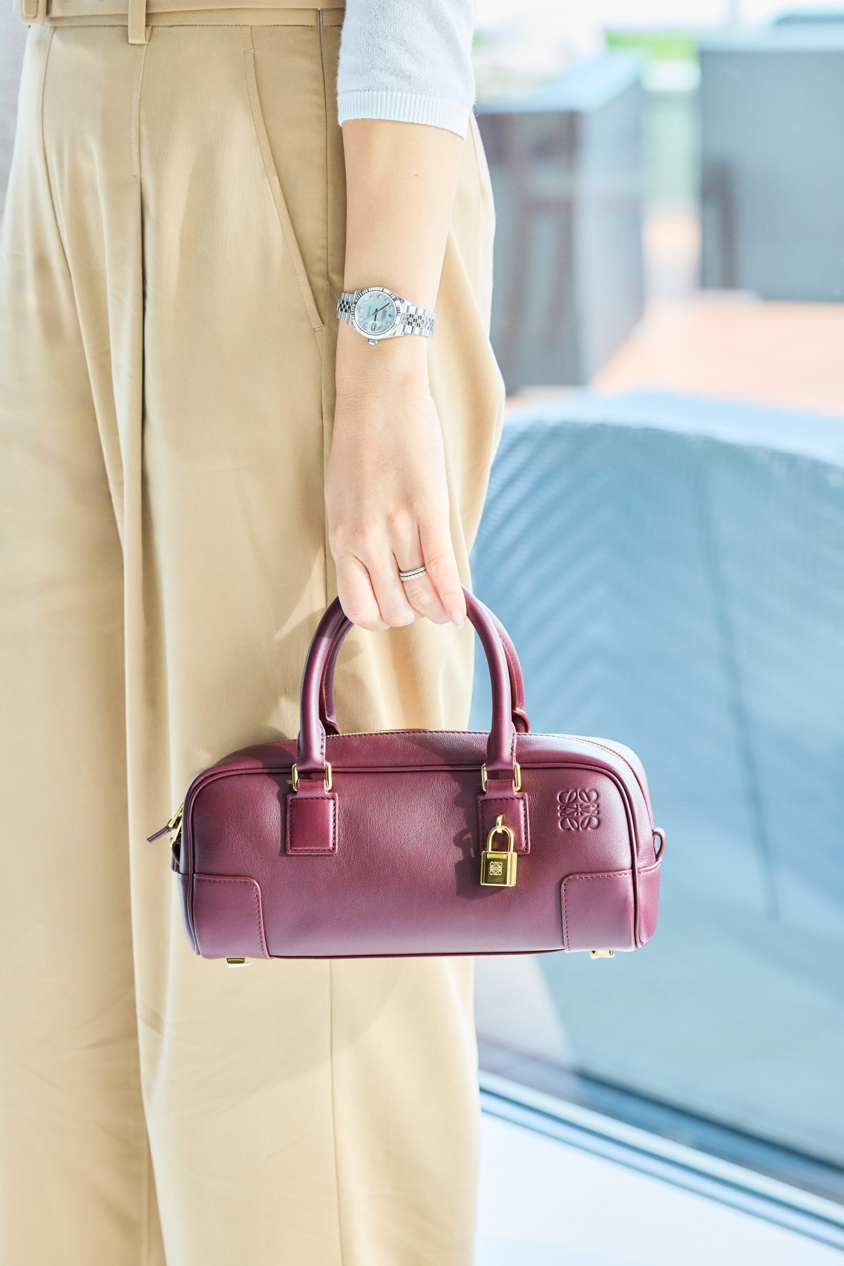 ベージュパンツとリンクするよう、バッグはバーガンディのロエベをセレクト。コンパクトながらお直し用リップもちゃんと収納できるし、写真を撮る時も持っていてちょうどいいサイズです。