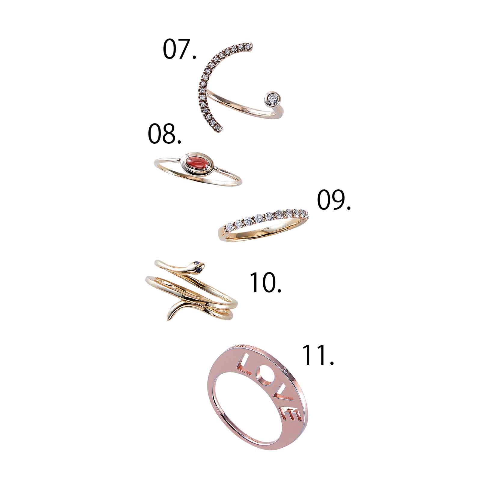 07.大きな弧を描く曲線と一粒のダイヤモンドで優美な指先に。リング[K10YG×DIA]¥176,000(ヒロタカ/ヒロタカ 表参道ヒルズ) 08.愛らしくクラシカルな印象のつややかなガーネット。深みのある赤で肌に透明感を宿して。リング[K10YG×ガーネット]¥41,800(ete) 09.細いバンドにダイヤモンドが並んだハーフエタニティリングでエレガントなオーラをまとって。リング[K18YG×DIA]¥176,000(ヴァンドーム青山/ヴァンドーム青山本店) 10.クレオパトラをイメージしたコレクション。古来、神や神の使いとして崇められてきた蛇を指先に。リング[K18YG×サファイア]¥275,000(Elena Jewelry/ロードス) 11.お守りジュエリーとして名高いブランドの大人LOVEシリーズ。大人の遊び心を指先に。リング[K10YG×DIA]¥132,000(カラットアー/イセタンサローネ東京)