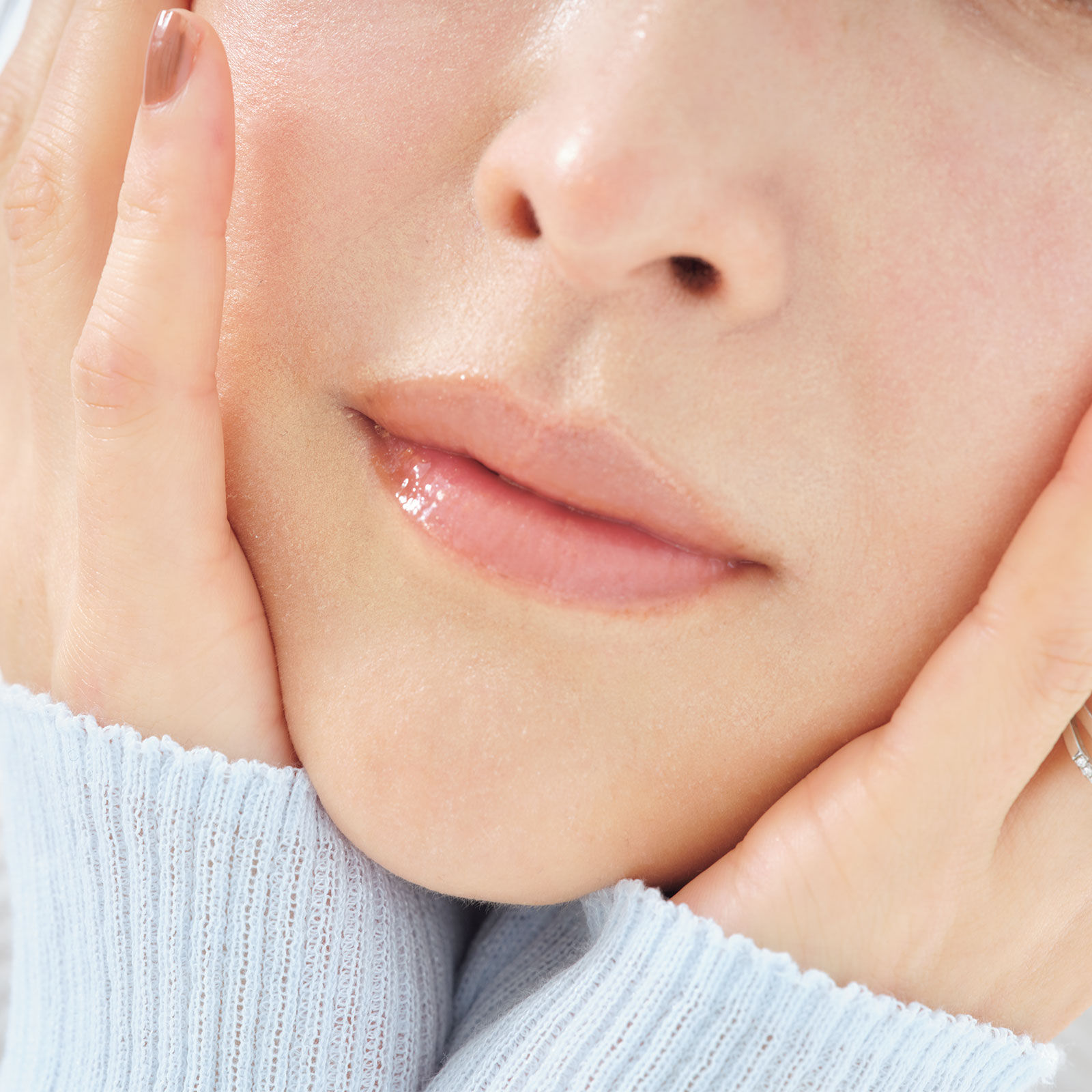 SUQQUのL-01をハイライトのように頰や鼻先に仕込めば、光を集めて自然なメリハリが。さらに上唇の真ん中に仕込むことで、よりふっくら&人中短縮効果も。出先でのお直しも簡単!