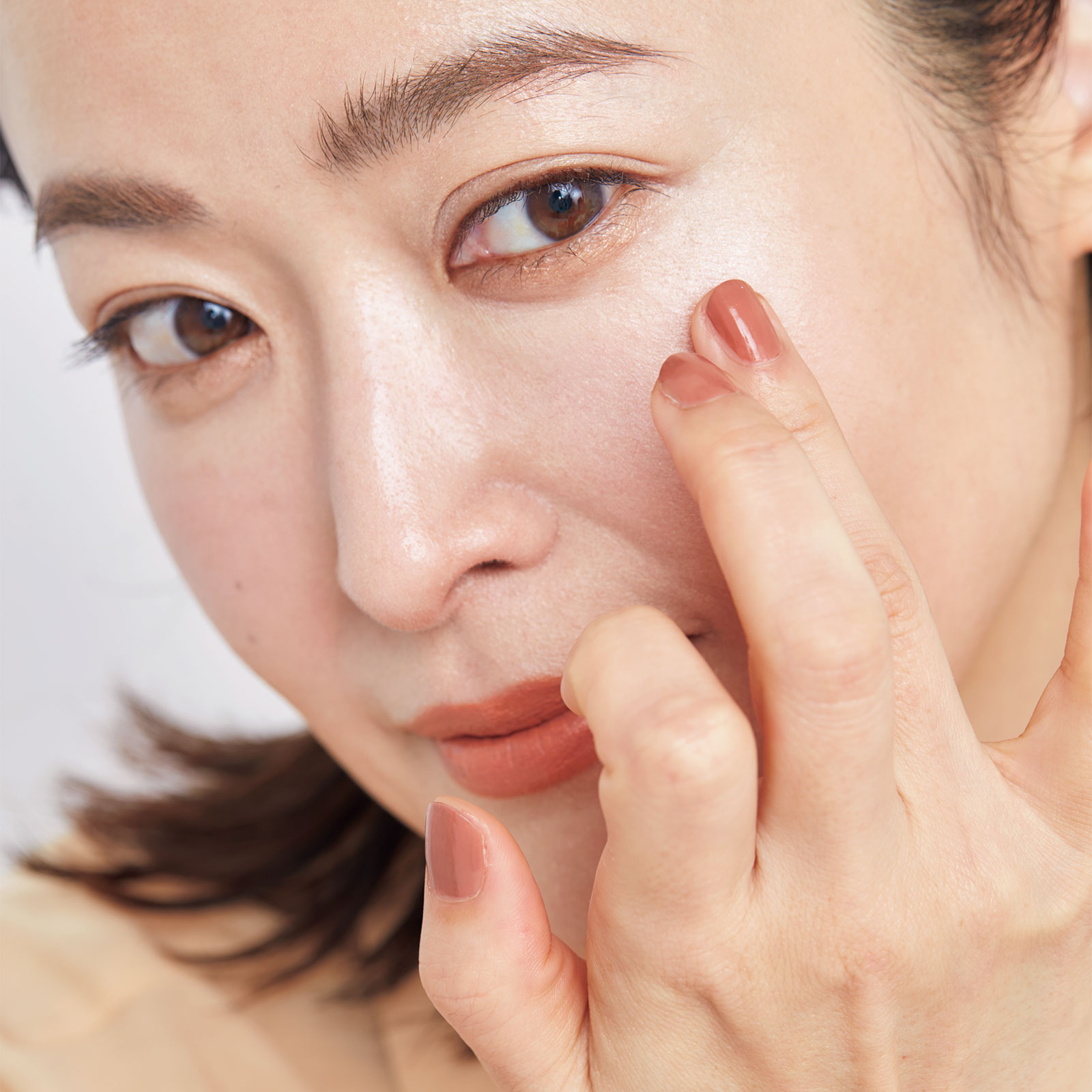 中指と薬指で優しく馴染ませます。人差し指だと力が入りすぎてしまうので、必ず中指か薬指を使って。