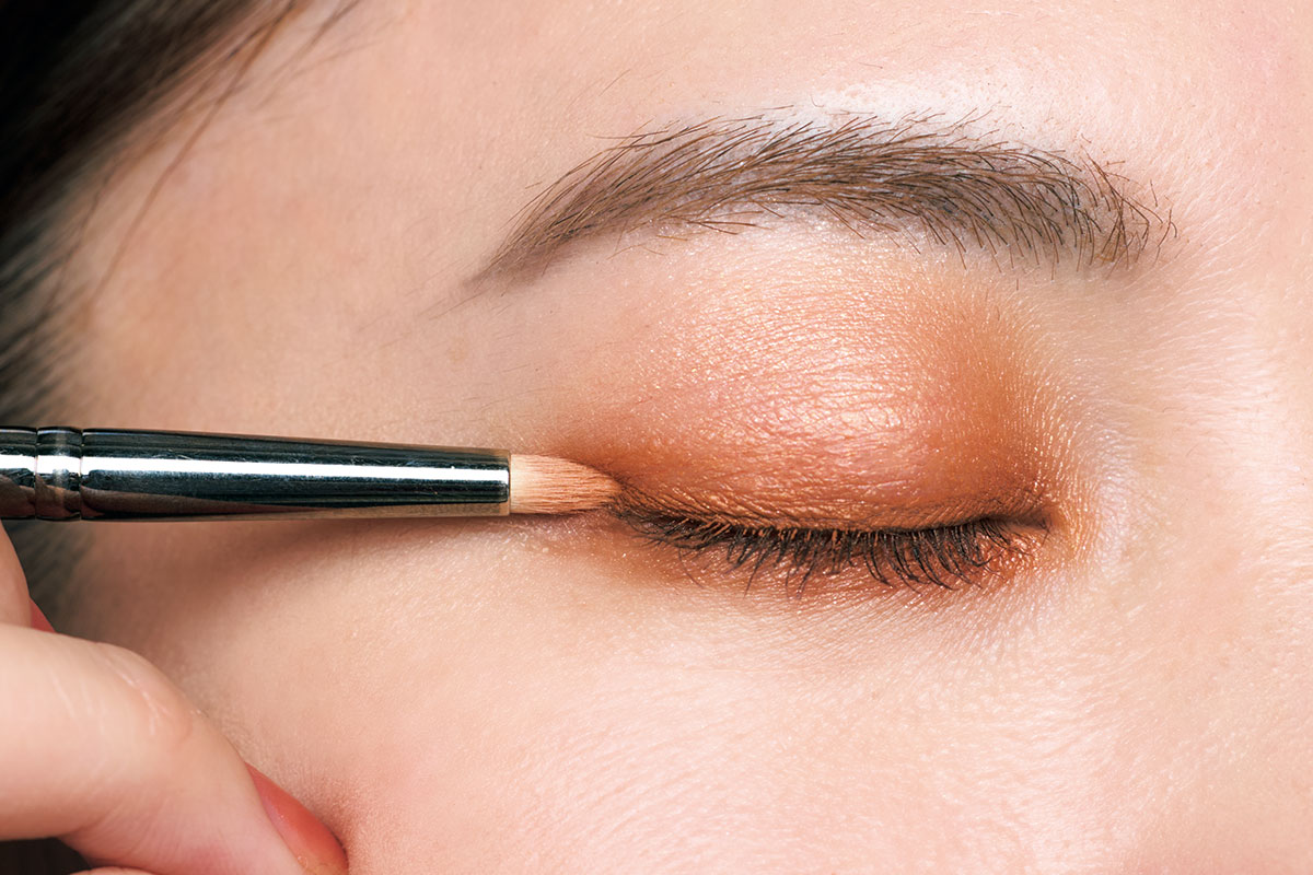 オレンジシャドウを細めのブラシにとり、上瞼のキワ(目頭から目尻まで)と下瞼のキワ(黒目の下から目尻まで)に塗ります。
