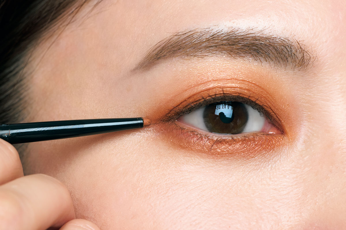 オレンジブラウンのアイラインを目のキワに細く入れ、目尻は平行に少しだけ出します。