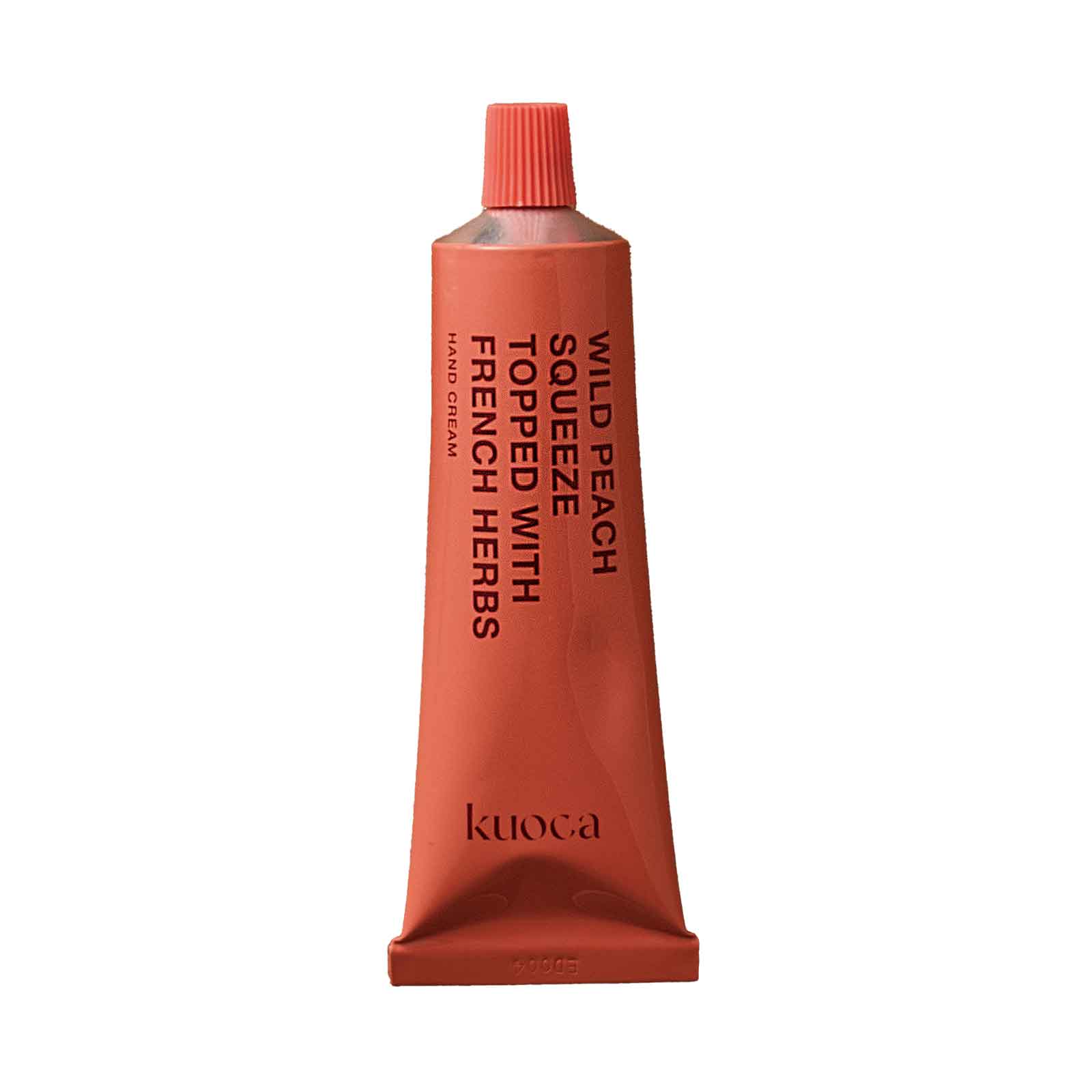 シアバター・植物性スクワラン・マカダミアオイル配合で保湿膜を形成。kuoca WILD PEACH ハンドクリーム 50ml ¥2,700(インテルコスメシ・ジャパン)