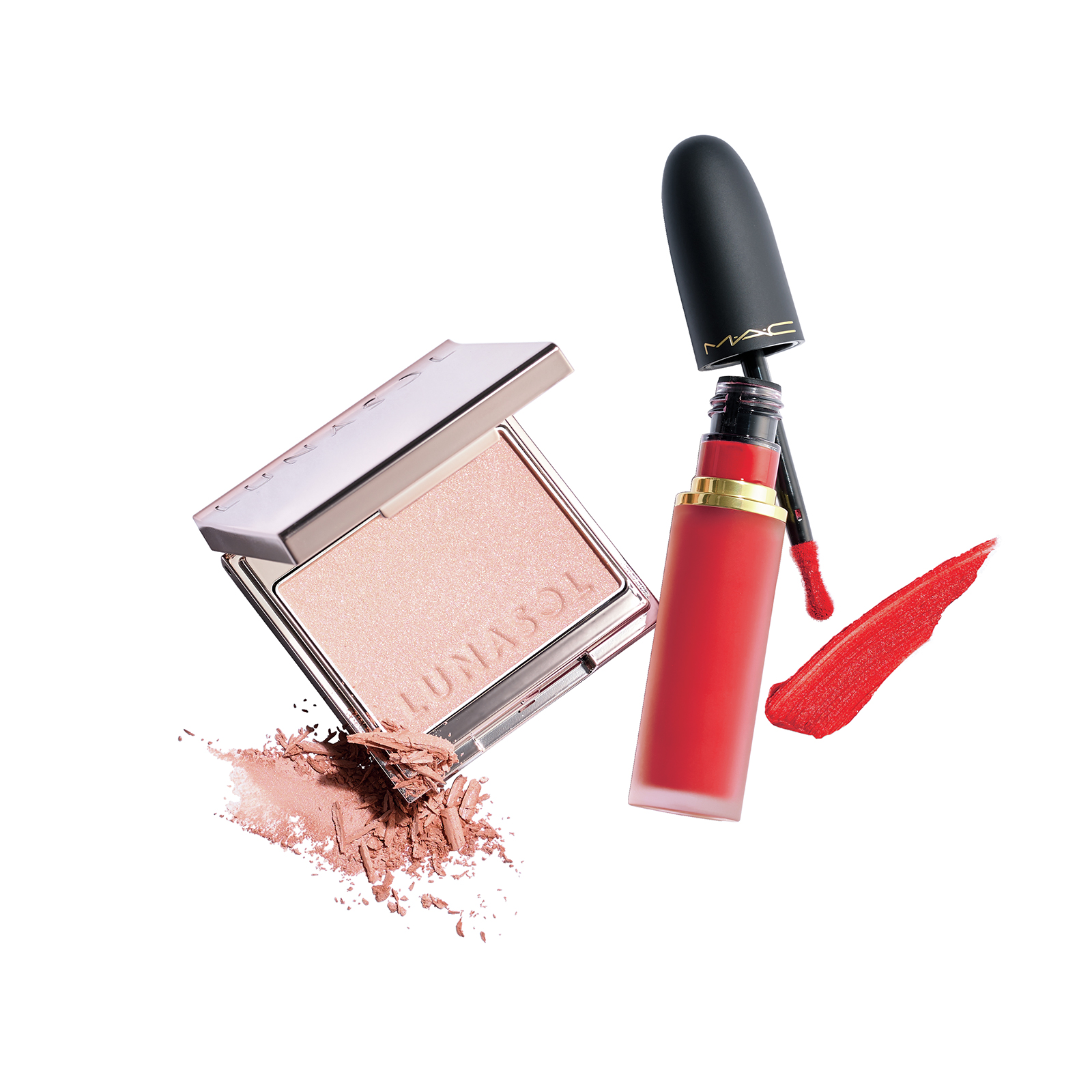 大きめのブラシにチークをとり、1で入れたチークのまわりに薄く重ねてから、頰全体へブラシを滑らせるように馴染ませます。ごく薄く重ねることで、ファンデやオレンジリキッドチークの色が肌と自然に一体化し、ほのかに上気したような仕上がりに。ピンクみを帯びたベージュトーンのチークは、透明感を引き出しながらクリアな肌に。(左)NARS ブラッシュブラシ #16 ¥6,160(NARS JAPAN)、(右)LUNASOL カラーリングブリーズ 06 Misty Aura ¥4,840 ※セット価格(カネボウ化粧品)