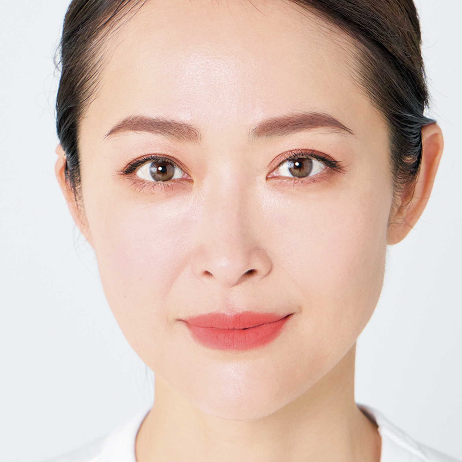 ベースで透明感のある肌に自らの血色のような健康的なオレンジチーク。若い頃の骨格と横のラインを意識して入れることで中顔面短縮の効果も期待できます。他のパーツもトーンを揃えると、バランスよく抜け感のある洗練された表情に。頰の上気でメイク全体が調和すると、気持ちまで上向きます!