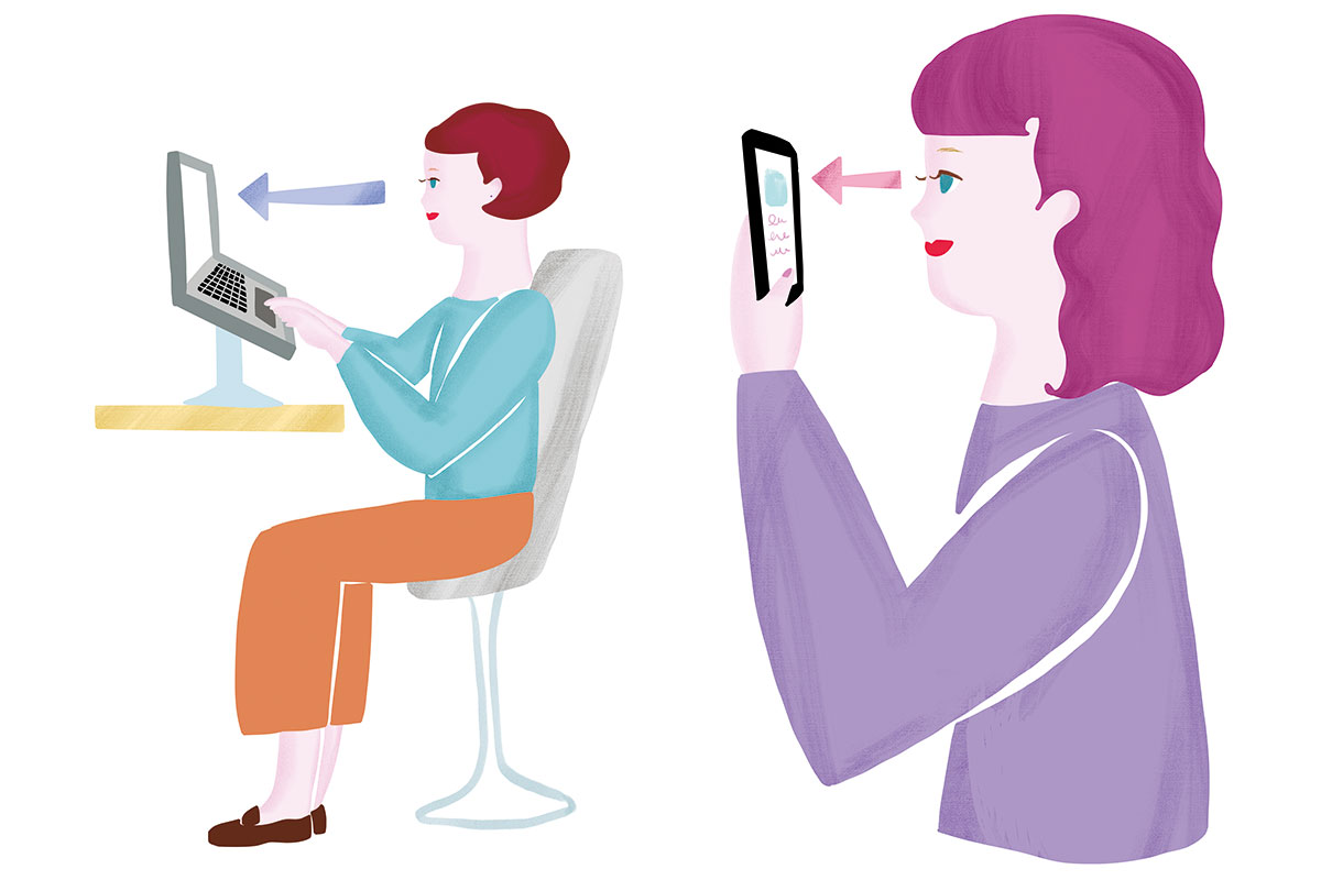 顔を下に向けると舌が間違った位置になって顎のたるみにつながるだけでなく、無意識に歯を食いしばるようになります。スマホを見る時はもちろん、パソコン作業をする時も台を挟むなどの工夫をして目線は上に上げること。