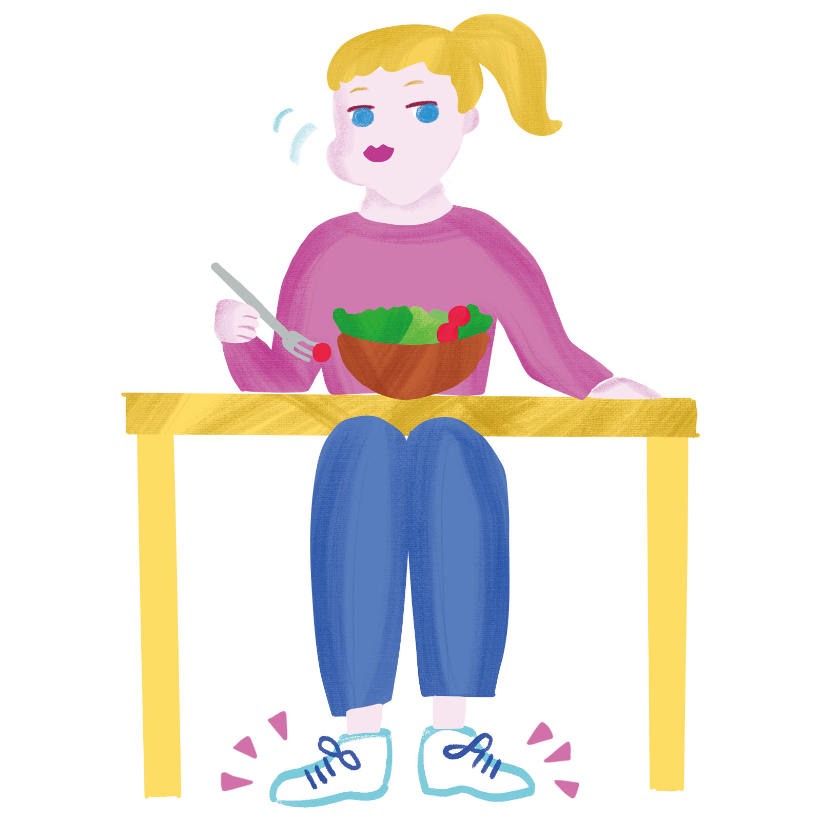 咀嚼回数が少ないと顎の筋肉が衰えて二重顎になりやすくなります。また、足が床につかない状態で食事をすると咀嚼回数が少なくなりがち。食事をする時は正しい姿勢で、足をしっかりと床につけて安定させて食べましょう。