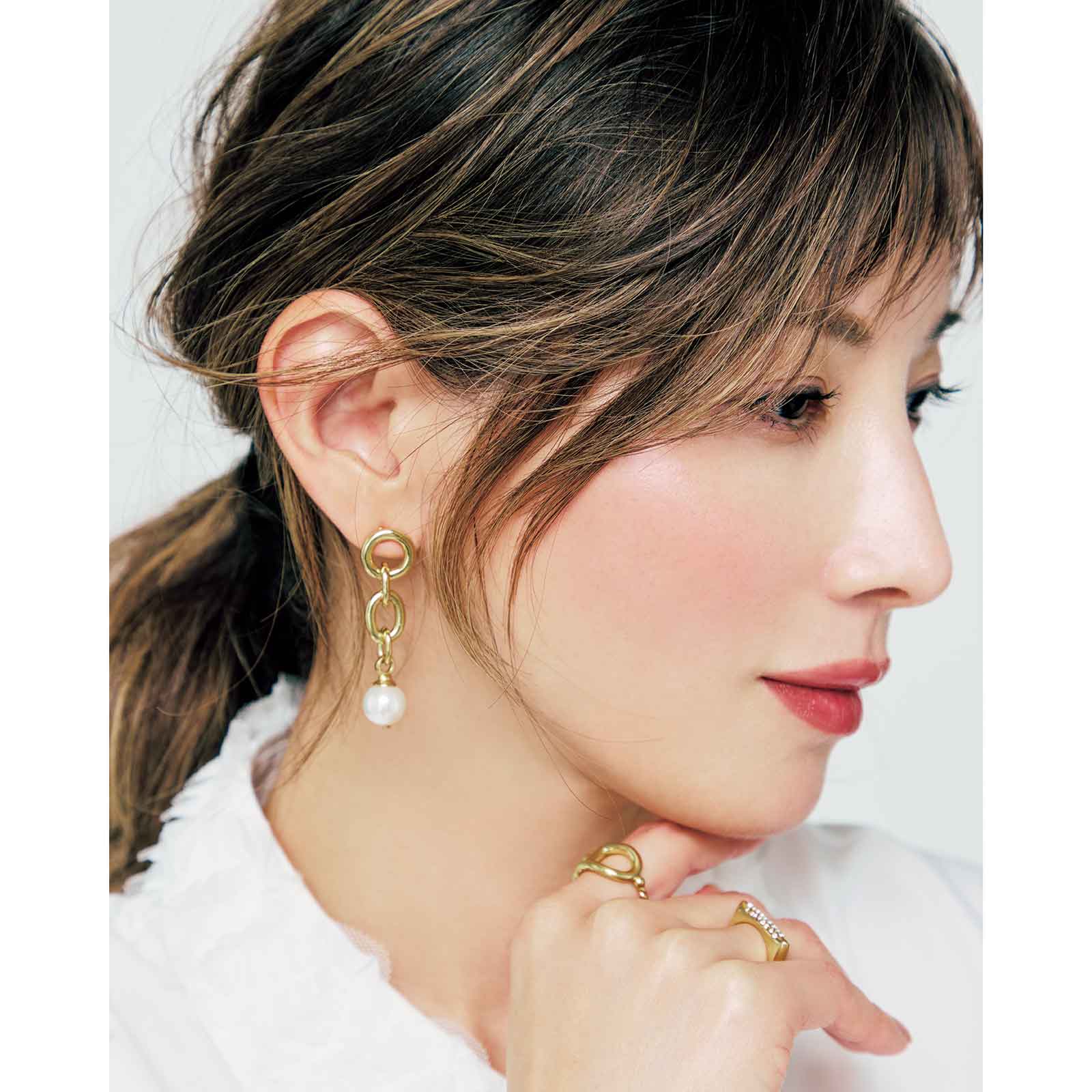 シャツ¥5,980(オペーク ドット クリップ)ピアス¥37,840(ベン・アムン/ズットホリック)リング[人さし指]¥8,360(チビ・ジュエルズ/チビジュエルズ・ジャパン)リング[薬指]¥19,800(masae/ロードス)