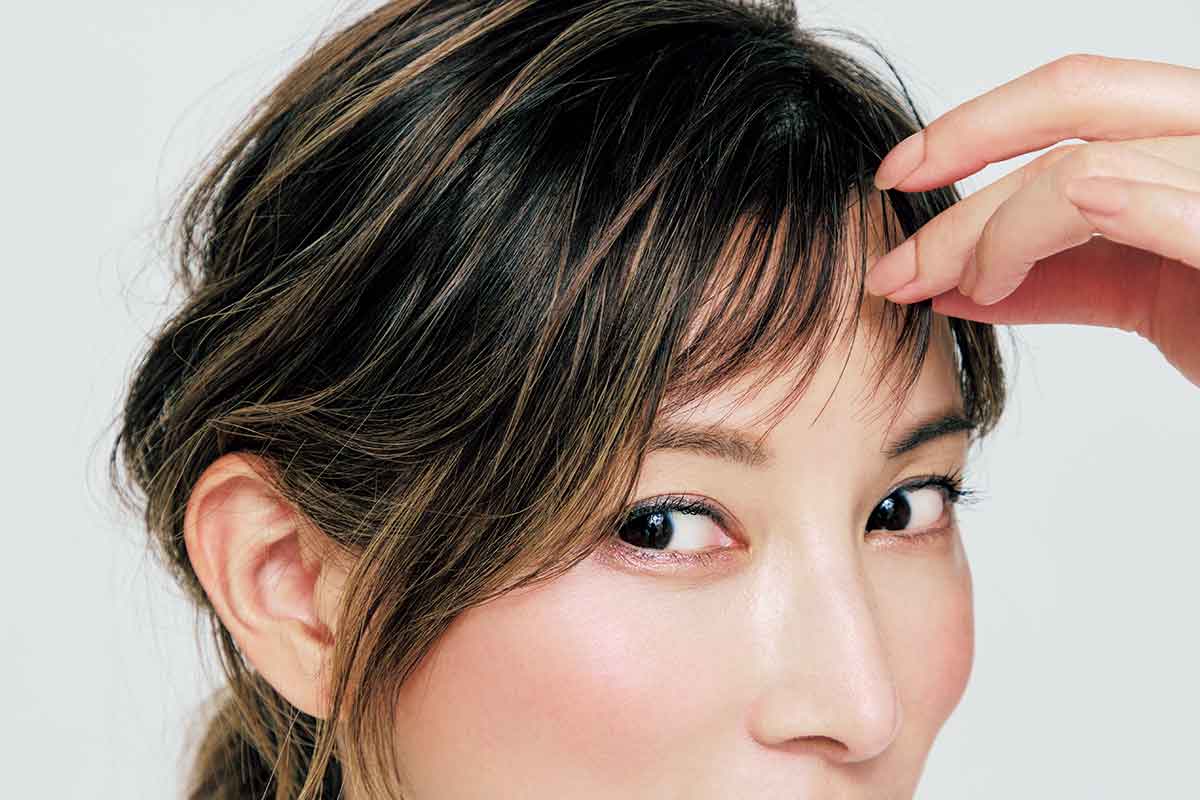 大人の前髪には軽やかさが必須。ブローかストレートアイロンで前髪を額に沿って下ろしたら、指に少量オイルをつけ、束を作るようにつまんで。透け感のバランスを見ながら整えると、小顔に見えつつ清潔感もプラス。