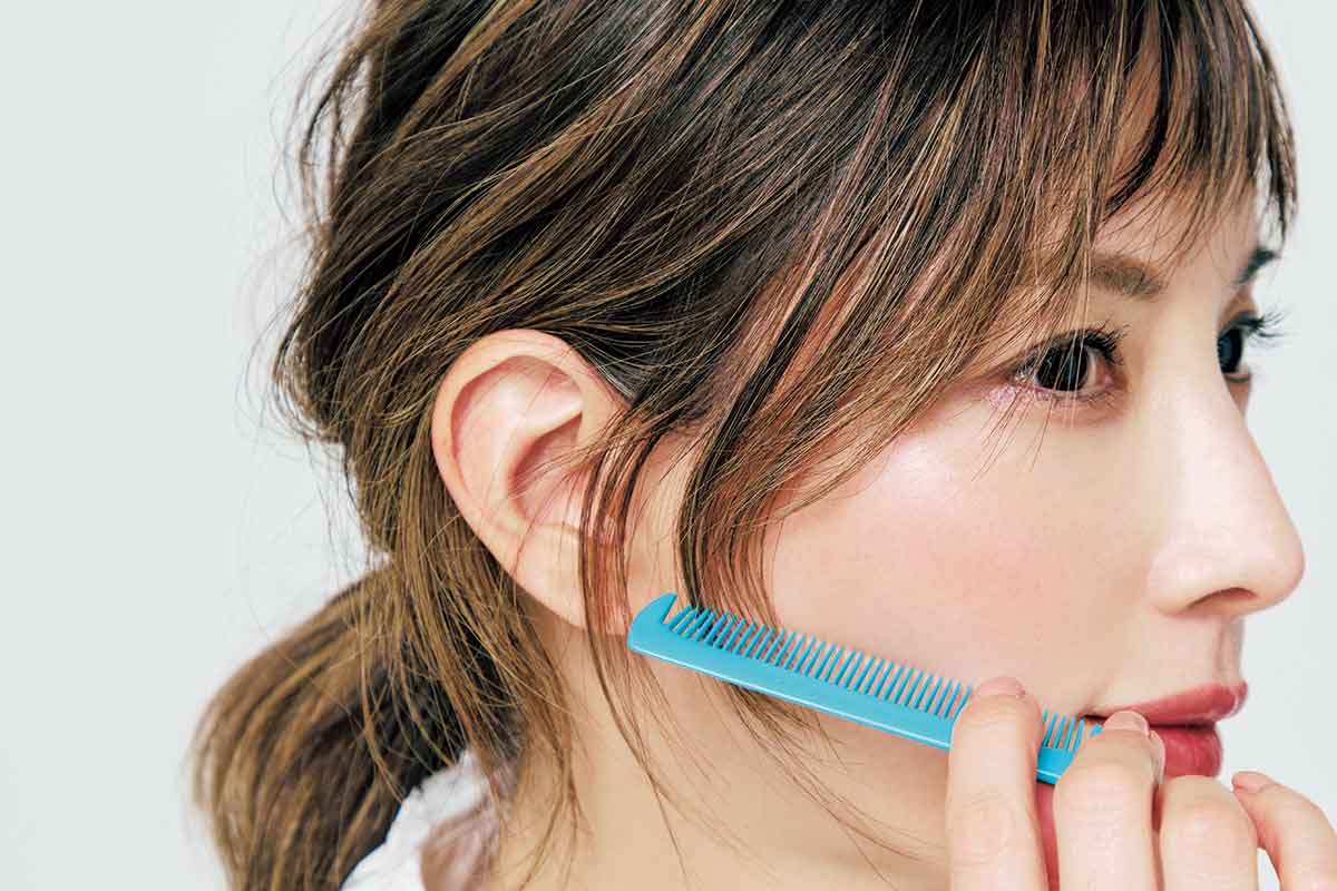 横髪は、こめかみと耳前の髪の毛、両方とも出すのがポイント。どちらかだけだと、横から見たときに肌面積が増えて小顔印象がダウン。輪郭に沿うようにコームで形を作ったら、スプレーでキープして。