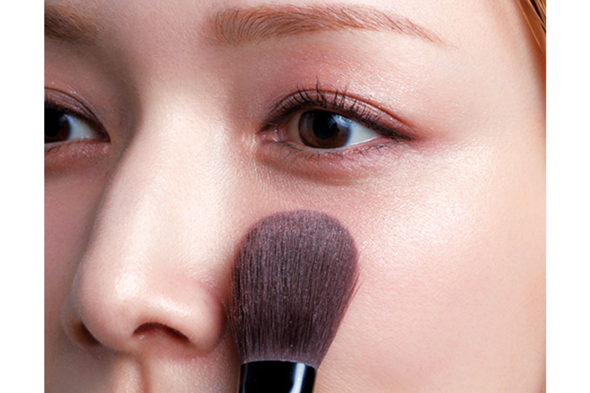 YSL メイクミーブラッシュパウダー 44は高発色なので平たいブラシで軽くオン。目頭と小鼻の中間位置から頰のトップに向かってふんわりと。