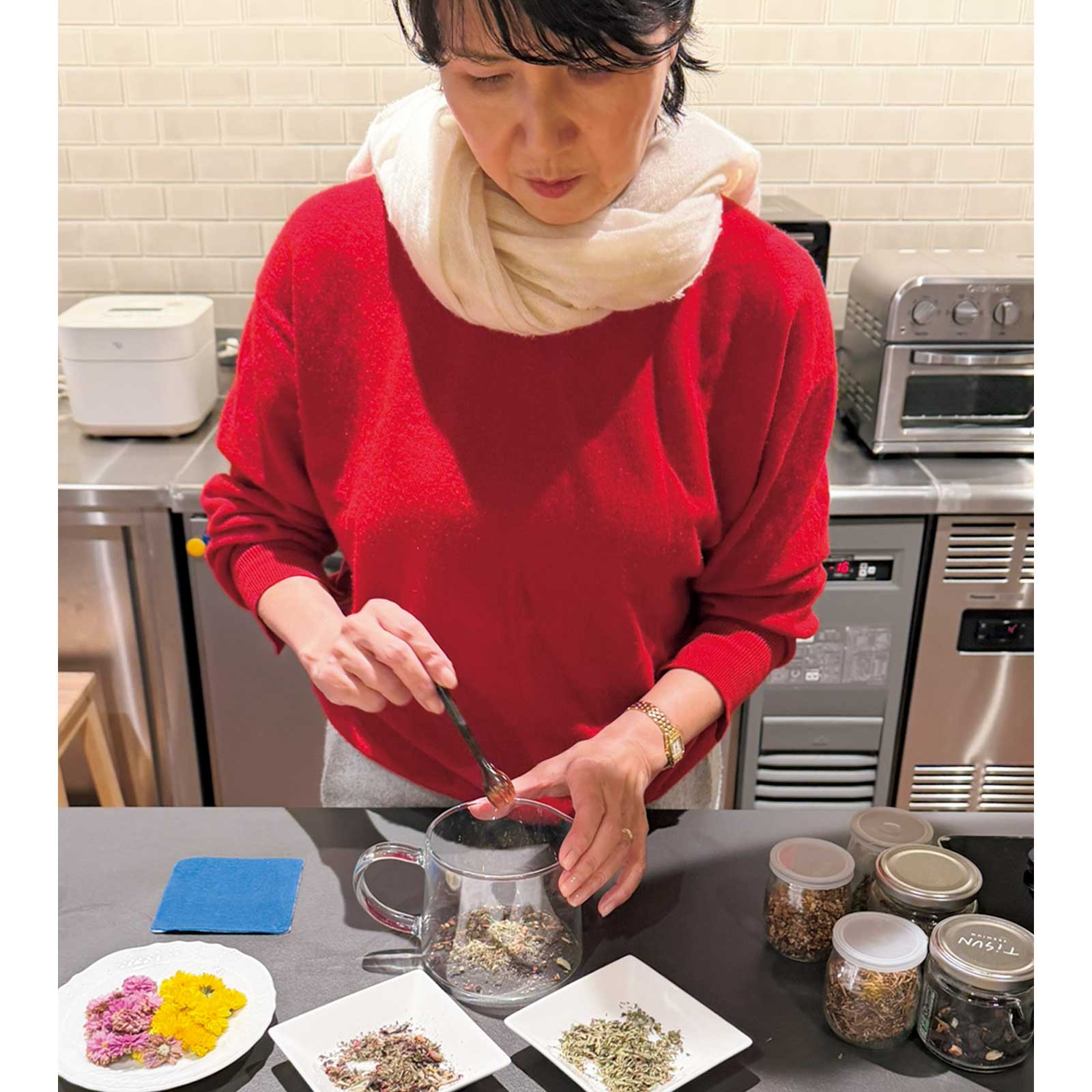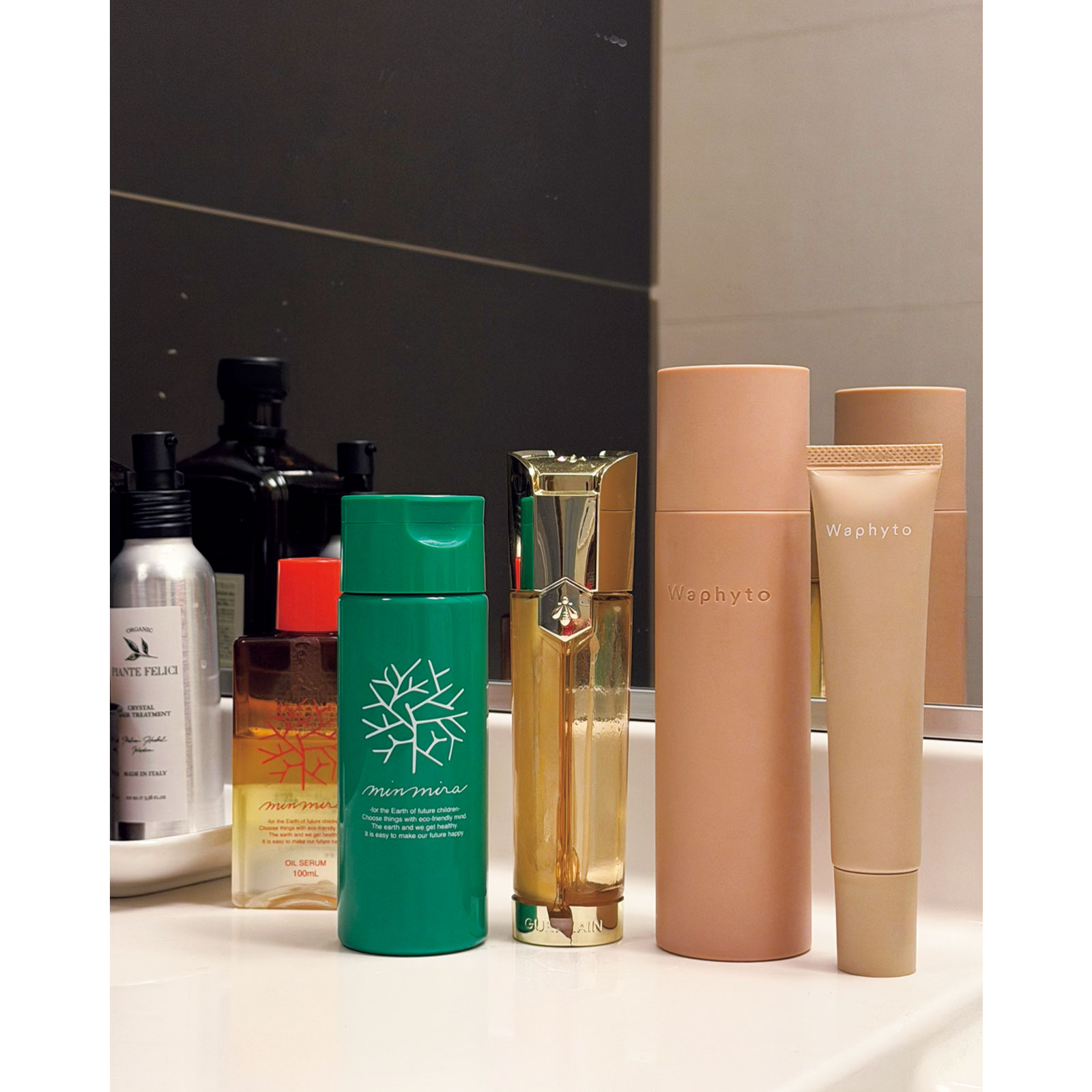 フィトテラピーと出合ったきっかけは、20代で自己免疫の病気になったこと。薬の副作用で肌はザラザラ、髪の毛はなくなり、生理も止まりました。その後ヨーロッパの大学で学んだ植物薬理学を実践すると、30代後半には体調も肌もずいぶん変わりました。やったことは自己免疫を上げるためのケア。それは今でも習慣の一部です。日々の食事に気をつけ、冷えたら生姜湯を飲んだり、疲れたときには高麗人参を摂ったり。家や会社にはハーブがずらっと並んでいて、朝はそれらを煎じてからしか仕事をしません。至るところに免疫を助けてくれる物を置いて、体の声を聞いたらすぐ対処する。こんな生活を続けていたら、去年1年間、1日も休まなかったくらい調子がいいですよ。肌も昔はセンシティブでしたが、今はほとんどゆらぎません。化粧品ももちろん使います。最近は雑誌で見かけて気になった米糠の洗顔料とゲランの美容液がお気に入り。オーガニックかどうかだけじゃなく、自分がご機嫌でいるためには、使って気持ちが上がることも大切にしています。