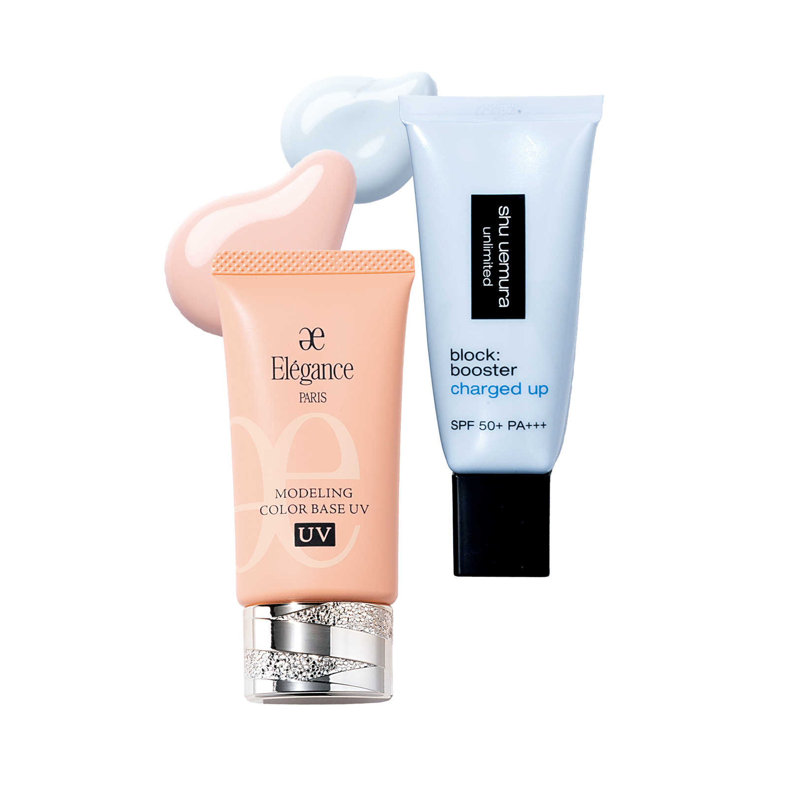 「伸びが良く主張しすぎないカラープライマーで、アラを隠すのがマスト。ブルーは顔色が悪くならず、透明感を引き出して赤みも打ち消すシュウをセレクト。オレンジは透け感とカバー力のバランスが優れたエレガンスを。白浮きせずに沈んだ肌色を補整してくれます」(AYAさん)。左:温もりのあるヘルシーな印象へ。モデリング カラーベース UV OR220 30g ¥5,500(エレガンス コスメティックス) 右:独自のブルーパールが◎。アンリミテッド ブロック:ブースター アドバンスト ルミ ブルー 30ml ¥5,830※3/4発売(シュウ ウエムラ