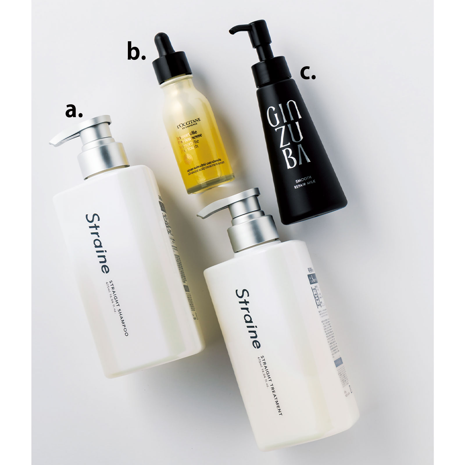 a.世界初のストレートシルクケア成分配合でクセやうねりを解消。ストレイン ストレートシャンプー475ml¥1,980ストレートトリートメント475ml¥1,980(ともにAiロボティクス)b.毛包を活性化して弾む髪へ導く頭皮美容液。イモーテル プロユース アドバンストスカルプセラム50ml¥8,250(ロクシタンジャポン)c.うねりに特化した成分が髪内部とキューティクルにアプローチするミルク。スムース リペアミルク90ml¥6,820(ギンズバ)