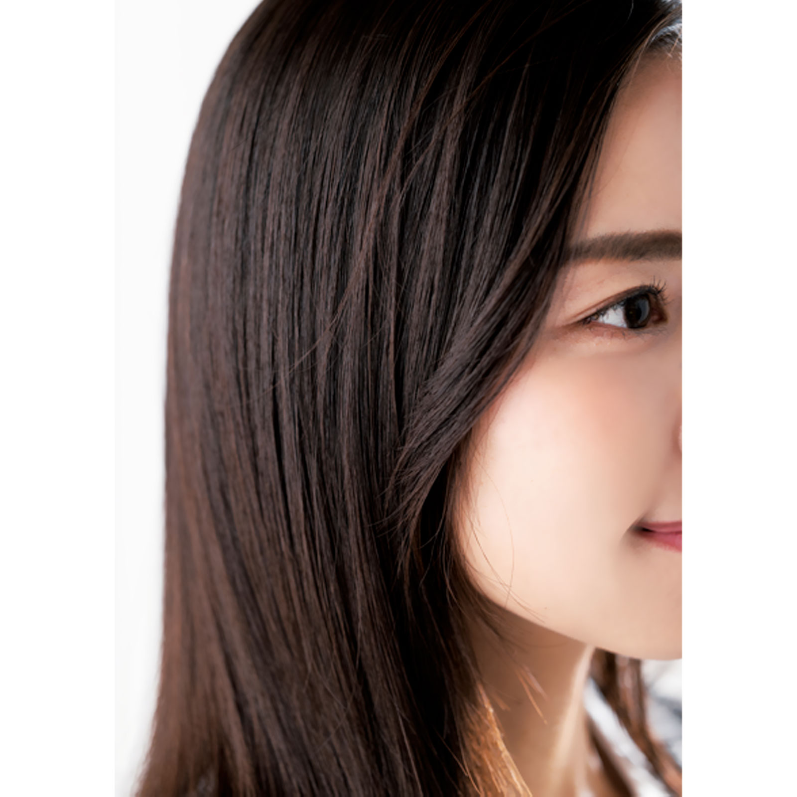首元の髪の根元が潰れるように、ドライヤーの風を上から当ててハンドブロー。ストレートアイロンで表面の髪の根元を挟み、毛先に向かってスライドさせてツヤを出します。仕上げにオイルをなじませてさらにツヤを。