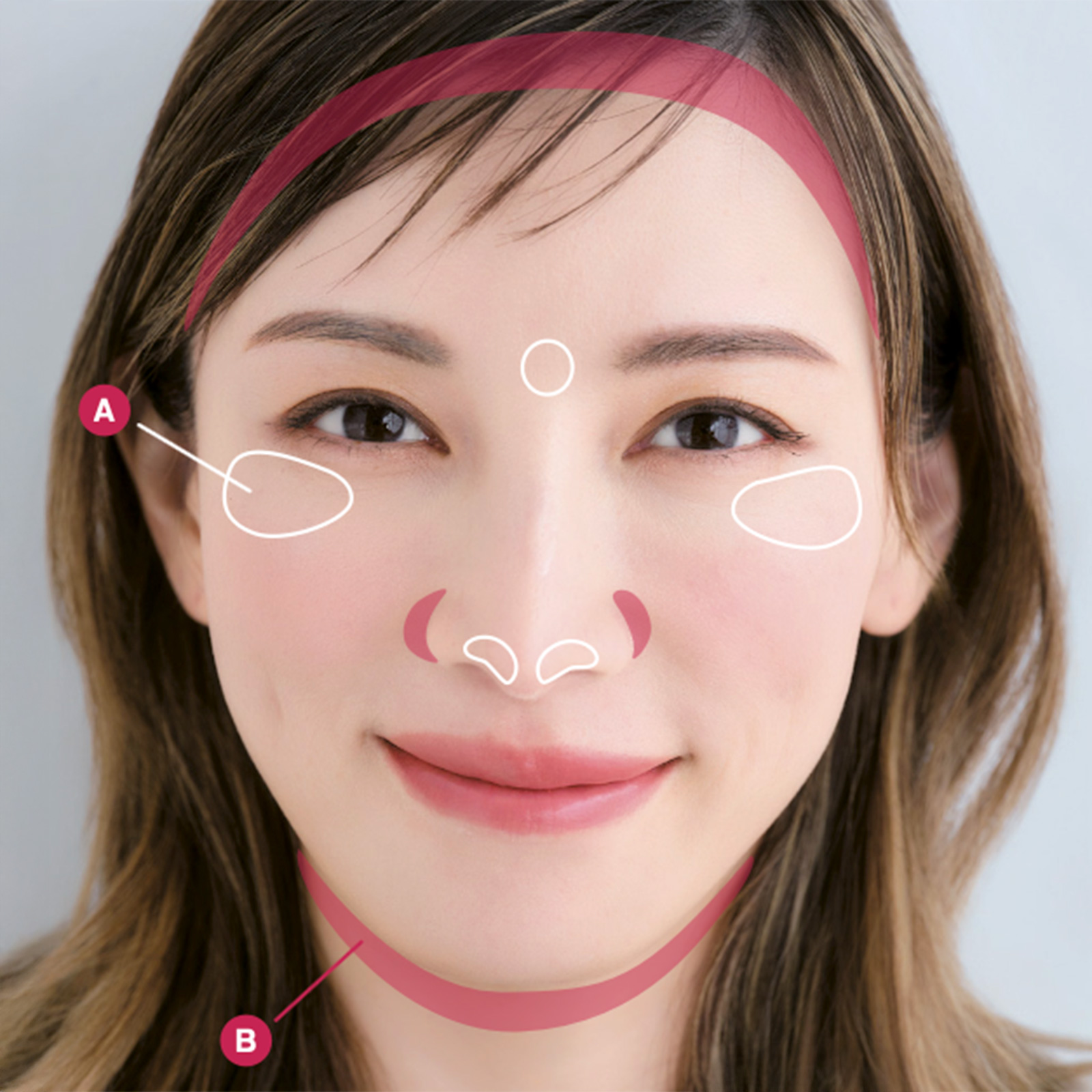 黒目の下の小鼻横位置に筆をのせ、外側に向かってぼかす。どこから撮られてもいいように、こめかみ寄りまで広めにのせる。