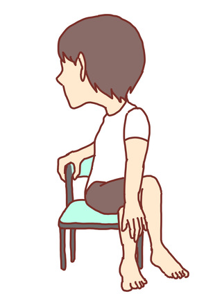 (2) 右足を左足にかけて足を組み、お腹をねじるように右側へ体をひねる