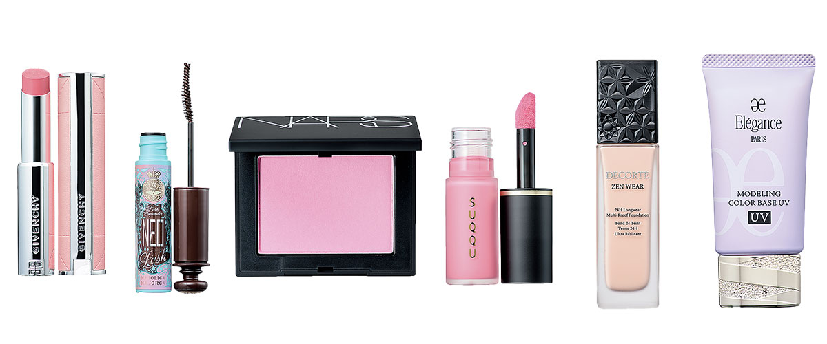 (左から)ヌーディピーチカラーで目元と合わせて。ジバンシイ ローズ・パーフェクト・シャイン No.109 スパイシー・メープル ¥5,060パルファム ジバンシイ数量限定、まつ毛の印象を優しく強める。マジョリカ マジョルカ ラッシュエキスパンダー ネオラッシュBR606 ダークブラウン(進化論)¥1,760 〈編集部調べ〉(資生堂)、Wチークで血色感をプラス。NARS ブラッシュ N 905 SEX FANTASY 5,390NARS JAPAN)、フレッシュなピンクを頰の中心へ。SUQQU コンプレクション フェイス カラー 101 惚々 -HOREBORE 4,950SUQQU限定色、艶のある美肌印象に。コスメデコルテ ゼン ウェア ステイ N16 SPF25/PA++ 30ml 7,700コスメデコルテ)、クリアな肌へと整えるパープル。エレガンス モデリング カラーベース UV LV660 SPF40/ PA+++ 30g 5,500エレガンス コスメティックス