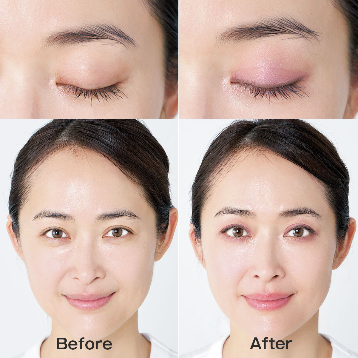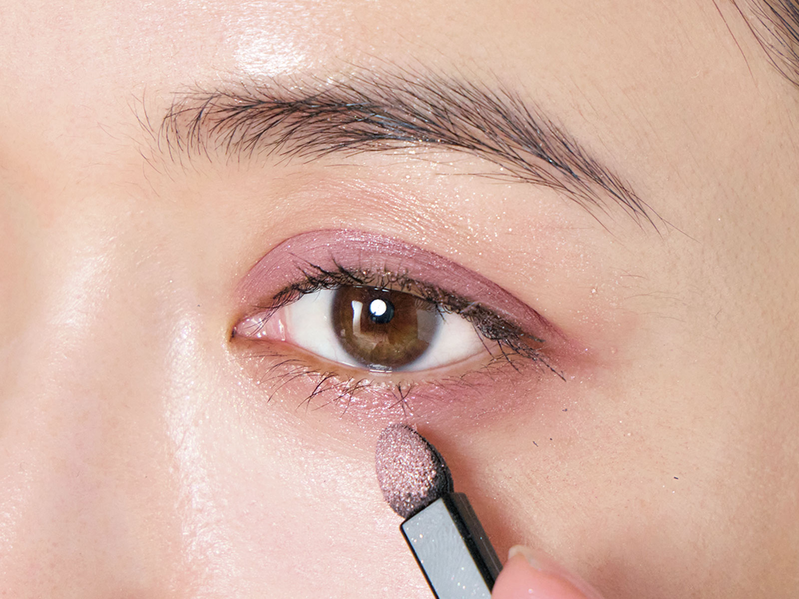 キラキラとしたラメは部分的に効かせることで瞬きのたびにさりげなくきらめき立体感も生まれます。まぶた全体に広げると悪目立ちしやすいので要注意。4種の異なる質感のピンクシャドウを重ね、チークやリップにもピンクみを取り入れて全体のトーンを揃えると、品よくまとまり、美人度が増します。