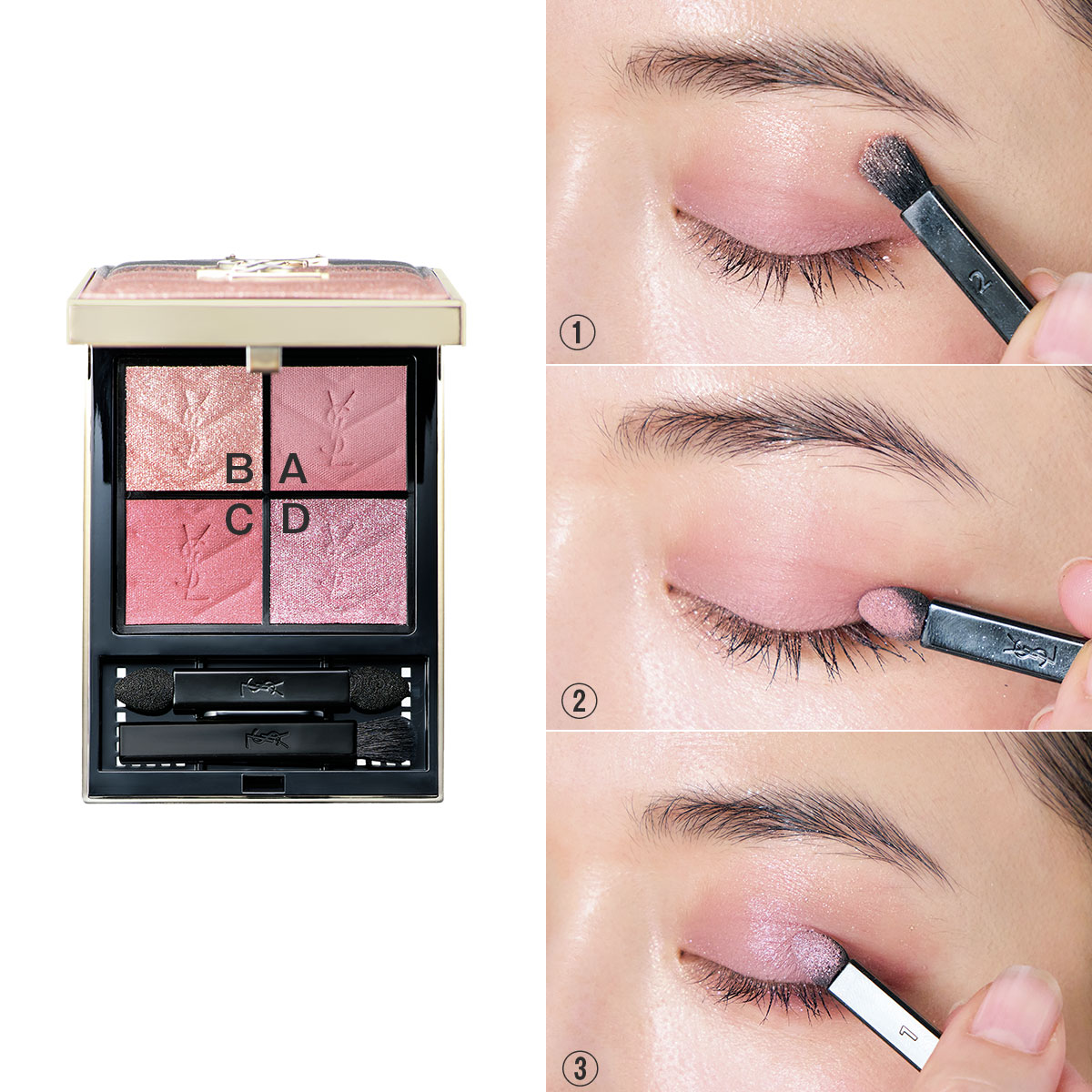(1)マットなソフトローズAをブラシに取り、アイホール全体にぼかしてくすみを飛ばします。続いてヌードグリッターBをブラシでアイホール中央に薄くのせ、眉下へつなげるように広げ、チップで目頭にもちょんと入れます。(2)Cのローズピンクを二重幅に入れ上へぼかしながら馴染ませます。(3)Dのシルバーモーヴグリッターをチップに取り、黒目の上にトンとのせてきらめきをプラス。YSL BEAUTY クチュール ミニ クラッチ 〈コレクター〉126 スパークリング ラスト ¥11,660(イヴ・サンローラン・ボーテ)数量限定