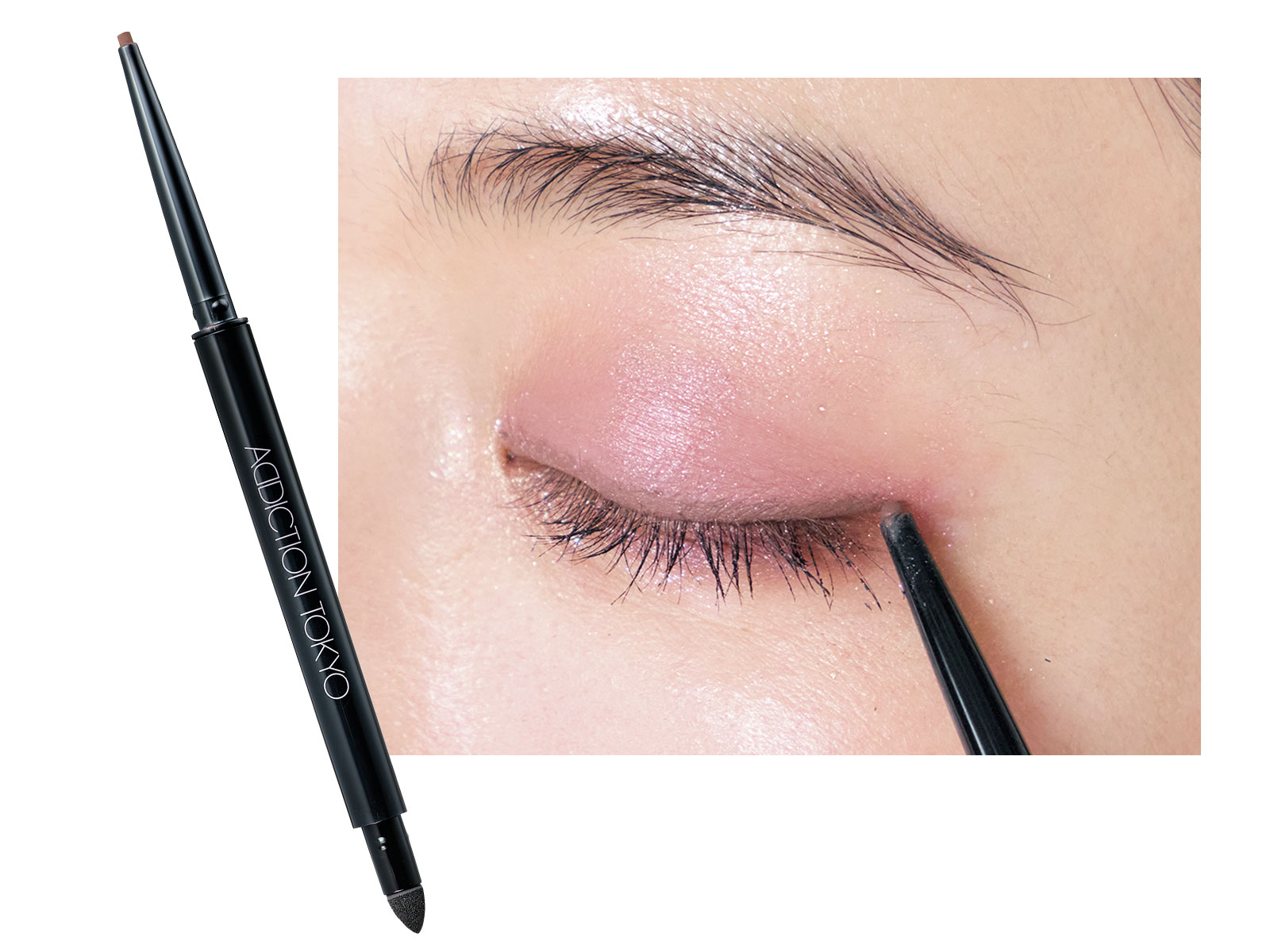 Cをチップに取り、側面を使って下まぶたの目尻側のキワ1/2に入れます。続いて、上まぶた全体にのせたAを下まぶた全体にやや太めに重ね、先ほど入れたCの境目をぼかしながら馴染ませ、ほんのり目元を引き締めます。締め色を使わなくても、質感違いのアイシャドウを重ねることで、自然な立体感が生まれ印象的な目元に。