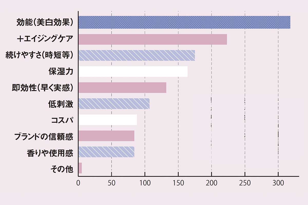 最重視は美白効果、次いでエイジングケア。くすみを払うだけでなくハリ・ツヤまで底上げしたい本音が見えます。さらに時短で続けやすく、保湿力、低刺激、即効性も譲れない。コスパと信頼感も含め“失敗しない商品”選びが理想!