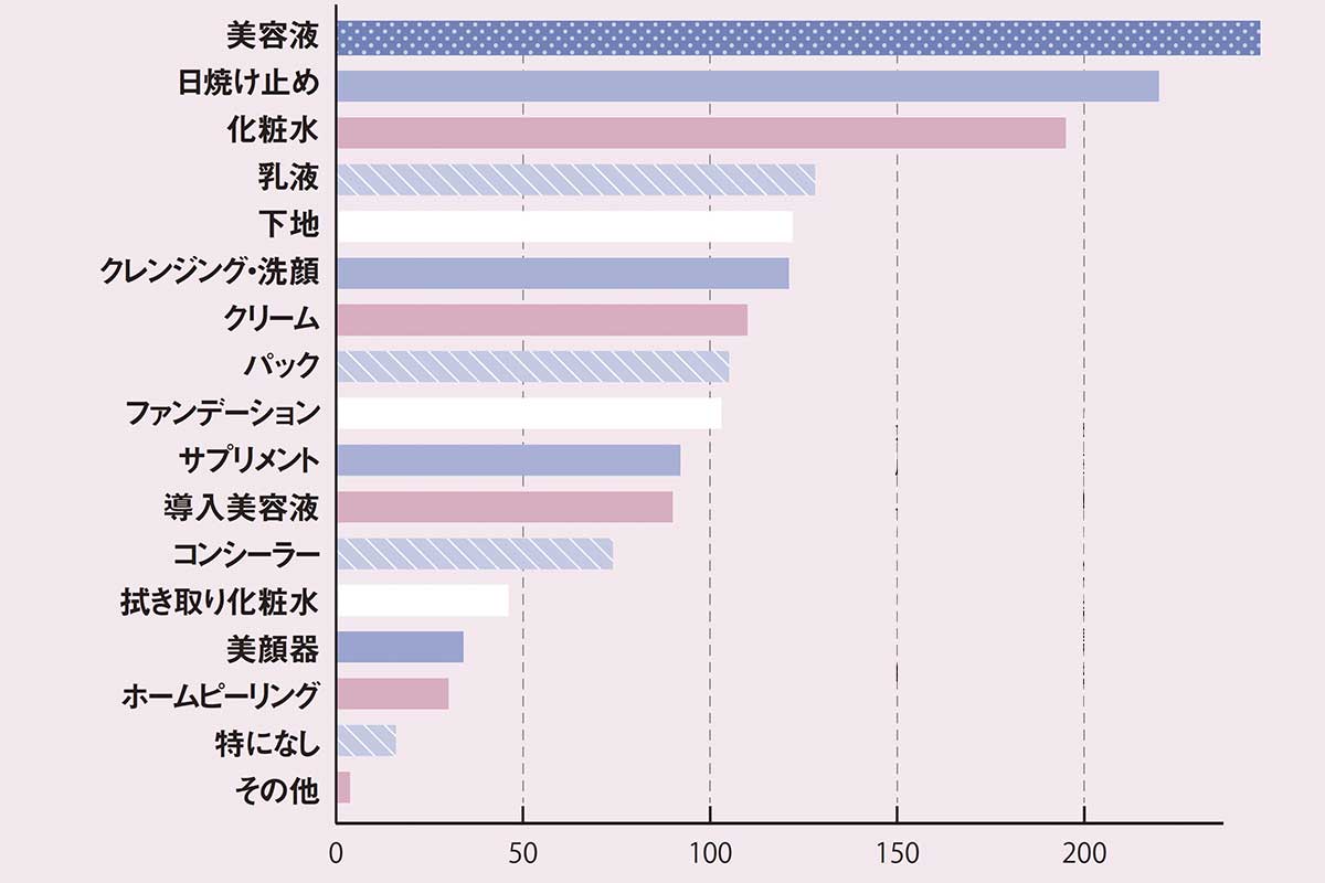 美容液と化粧水の基本アイテムが圧倒的。同時に日焼け止めが上位で“守り”も徹底。一方でクレンジング・洗顔やパック、ベースメイク系にも広がり、アイテム1点突破ではなく、トータル設計によって透明感を作っている様子。