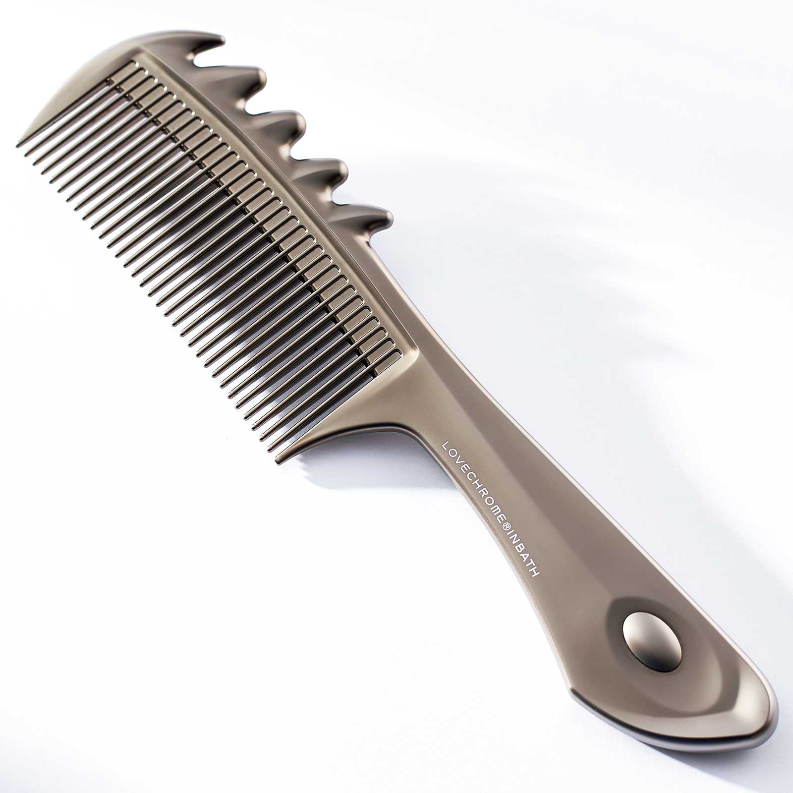 「トリートメントを開発する際の検証では、塗布後に適切な間隔のコームを通しまんべんなく纏わせた後に5分ほど髪に馴染ませると、浸透効果が格段にアップしました。コームを寝かせて使うとトリートメントを削ぎ取ってしまうので頭皮に対して垂直に、1ブロック1回ずつ通すだけでも違いは歴然です」摩擦を抑え、髪ダメージを軽減する表面加工。ラブクロムⓇINBATHスカルプカッサ プレミアムブラック ¥6,490(YC.Primarily