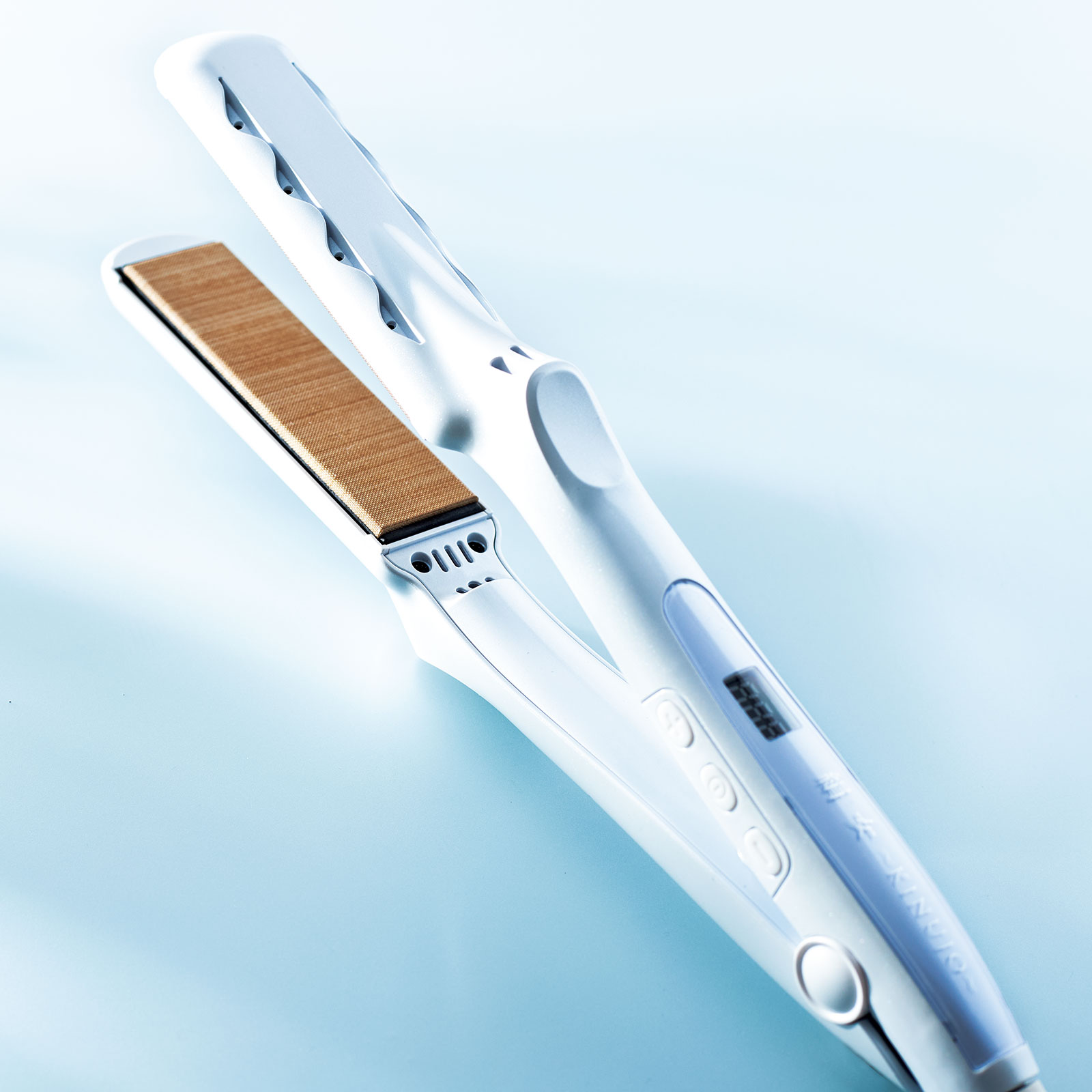「髪の手触りが硬くなったと感じるなら、原因は熱ダメージです。よく生卵を加熱して目玉焼きにすることで例えられますが、髪の毛も熱によるタンパク変性で硬くなるのです。アイロンの設定温度はデイリー使用の場合160度以下にすれば熱ダメージはかなり軽減されます」高温でも水蒸気爆発を起こしづらい独自素材のシルクプレートで髪の毛の水分を守ります。KINUJO ストーレートヘアアイロン ¥24,200(KINUJO